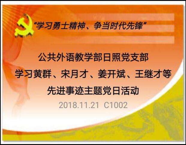 2018年11月21日下午3点,mk(中国)日照党支部在C1002举行“学习勇士精神、争当时代先锋”——学习黄群、宋月才、姜开斌、王继才等先进事迹主题党日活动。会议由支部书记杜庆凤主持,全体党员以及党员发展对象参加。