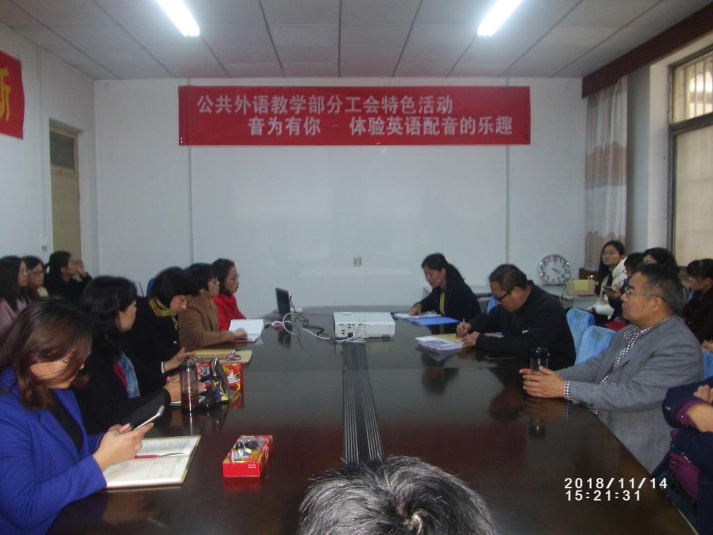 1114日下午三点,特色活动在会议室正式举行。汪娟老师就配音软件《英语趣配音》、郑桂玲老师就配音软件《配音秀》分别进行了细致介绍;仲蕾老师就配音软件的时长要求、参赛要求进行了补充介绍。老师们提前下载了配音软件,并跟随讲解步骤操作实践,表现出了浓厚的兴趣。