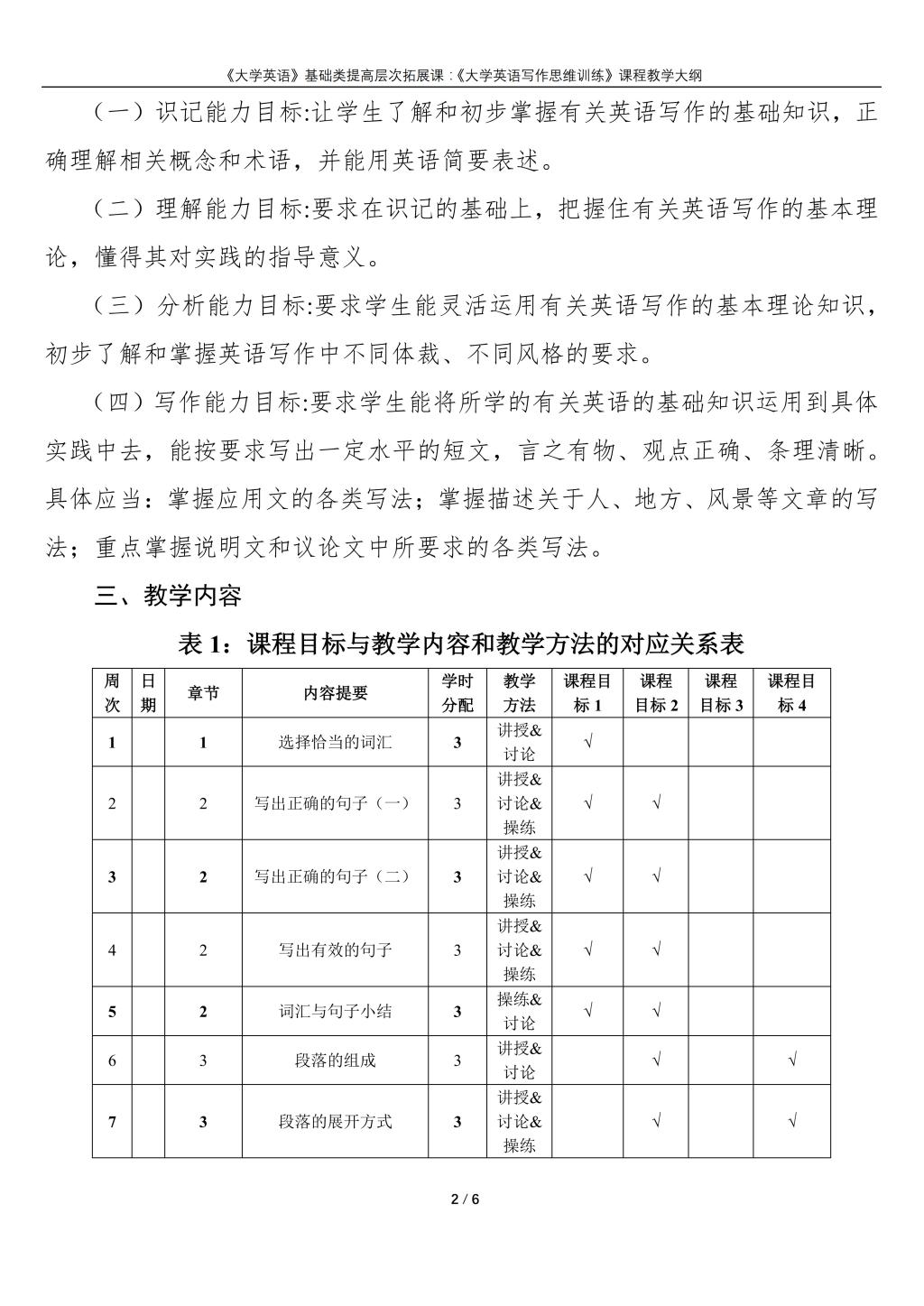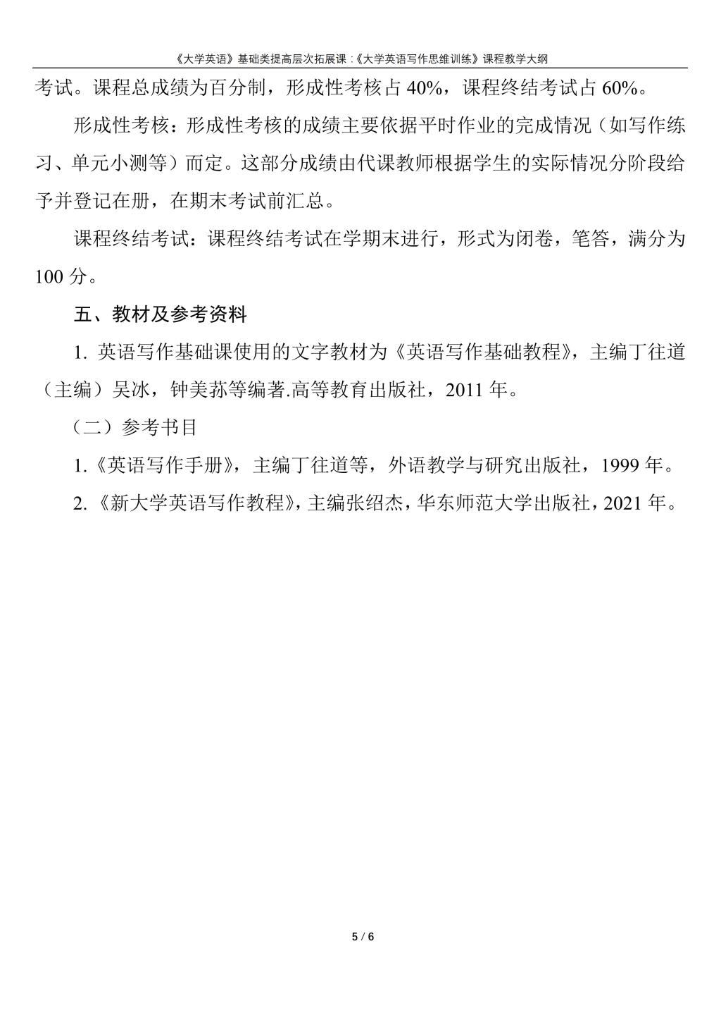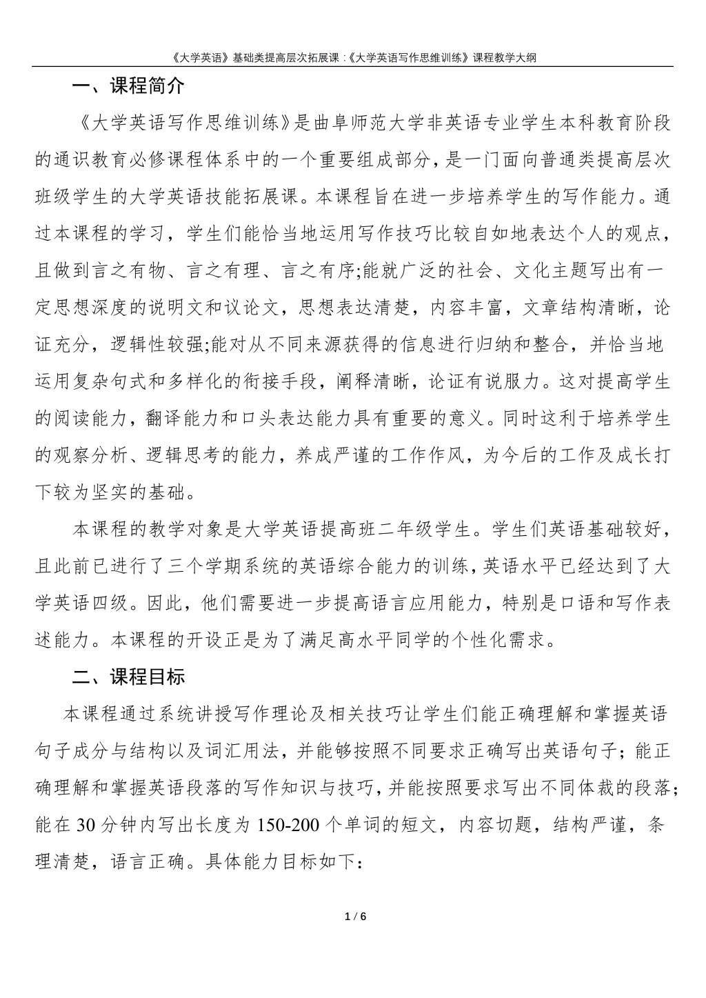 大学英语(普通类提高层次拓展课:《英语写作思维训练》)课程教学大纲(2022版)