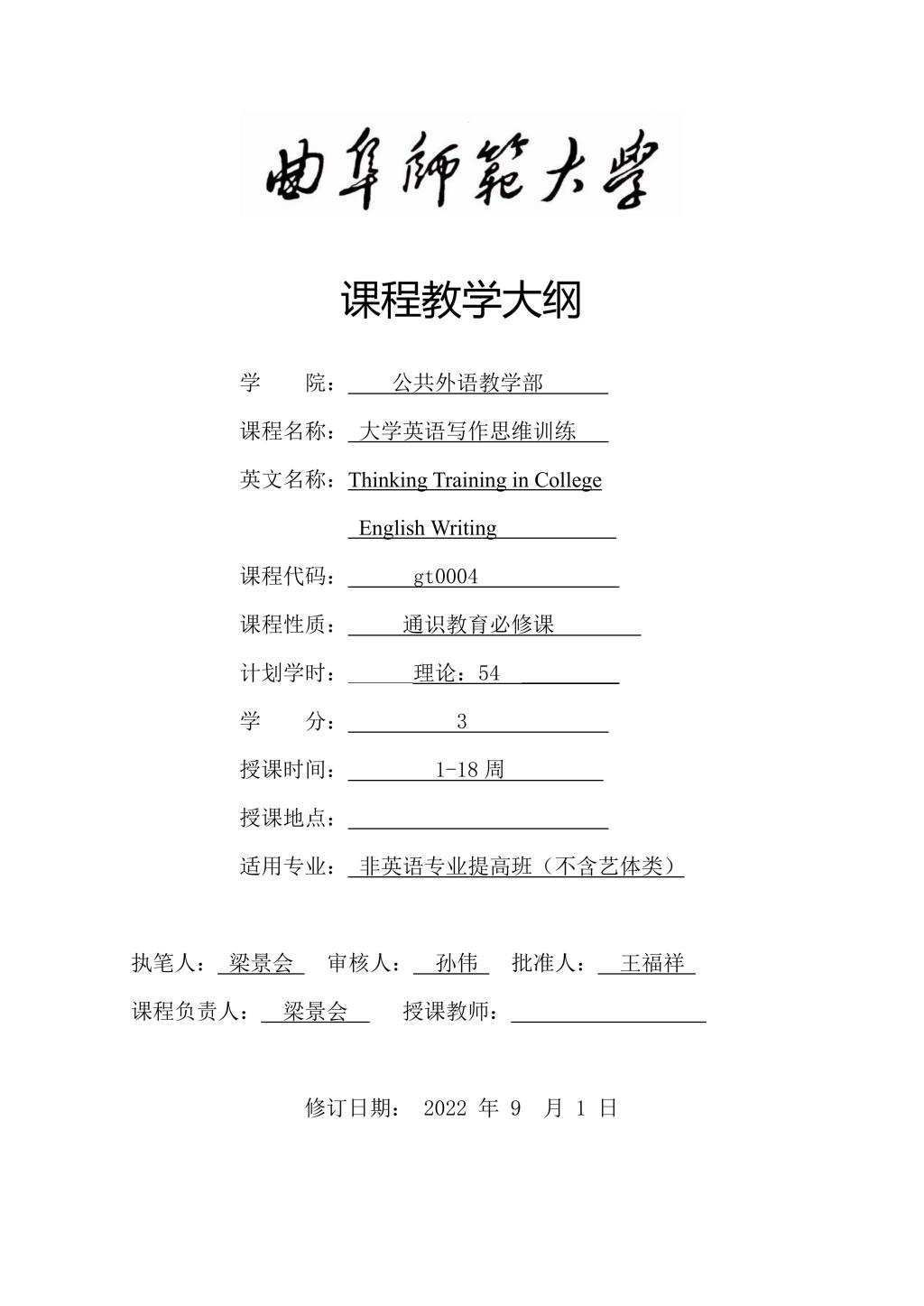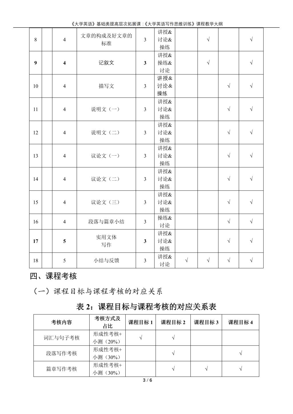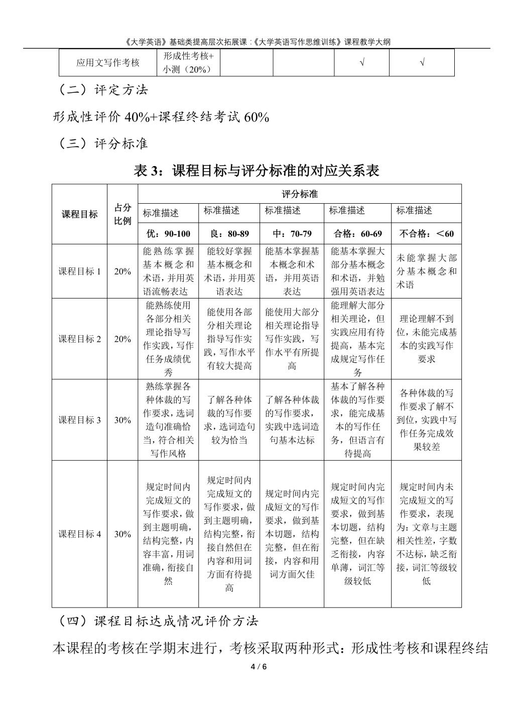 大学英语(普通类提高层次拓展课:《英语写作思维训练》)课程教学大纲(2022版)