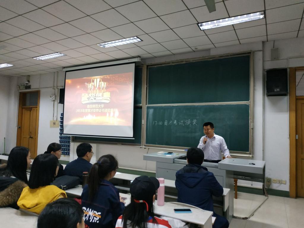 作为考试组织单位,北京外国语大学外语教学与研究出版社区域经理李洪旺宣布了2019年5月国才考试报名工作正式启动,简单介绍了本赛季考试的一些变化和注意事项;随后宣读了获得国才优秀、良好、合格的同学名单。李洪旺经理宣布颁奖开始。